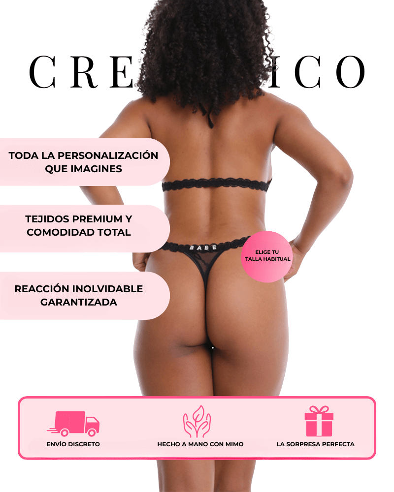 Esto no es solo lencería. Es un secreto compartido, una chispa que enciende momentos inolvidables. Personalizado con vuestro nombre o esa palabra especial, cada pieza es una promesa de conexión que se hace más fuerte con el tiempo.